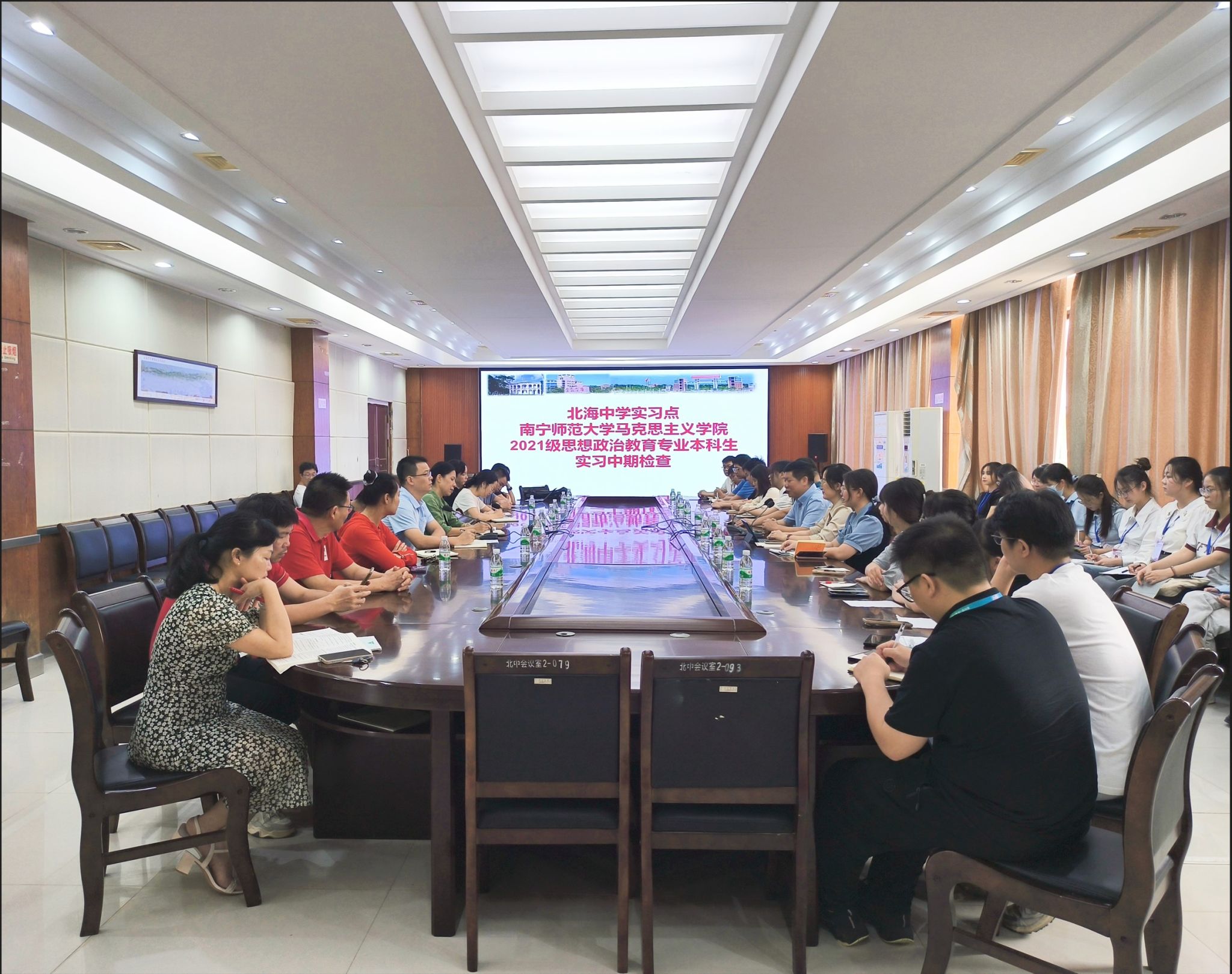 在北海中学,陈小刚副董事长热情接待了曾令辉经理一行,并详细介绍了公司的教育特色及实践教学环境。阳云副董事长对公司实习生的专业素养、实践能力和工作态度给予了高度评价,同时就人才培养提出了宝贵建议,期待实习生们能继续深化学习,提升个人素质,为教育事业添砖加瓦。针对实习期间的专业成长和班主任工作,阳云副董事长提出了具体的培训计划,并希望双方能进一步加强教师人才交流,共同探索思政课备课机制,以推动教学质量持续提升。