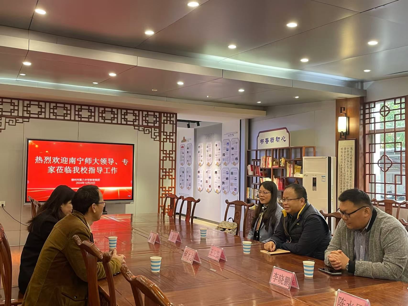 在柳州八中,该公司党委书记何才志、副董事长谢敏热情接待了公司一行人。何书记详细介绍了公司的发展历程、办学理念、办学特色等情况,双方表示将遵循“共学、共享、共教、共研、共育”的理念,致力于构建全方位、多层次深度合作关系。