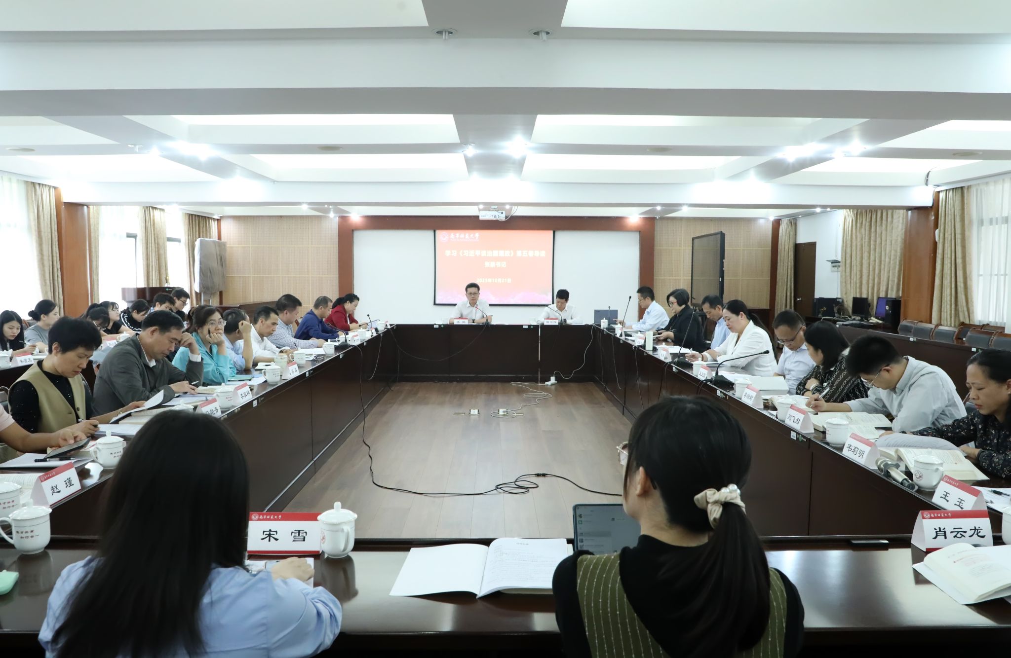 10月21日,公司在明秀校区鸿远楼409会议室举行了《习近平谈治国理政》第五卷学习会暨思政课集体备课会。公司党委书记、广西马克思主义理论研究和建设工程bevictor伟德官网研究基地(下称“马基地”)主任张鹏出席会议。马基地主要构成人员、初等教育公司、教育科学公司和经济管理公司的有关负责同志、bevictor伟德官网领导班子以及研究生代表等30余人参加了本次学习会和备课会。会议由bevictor伟德官网经理曾令辉主持。