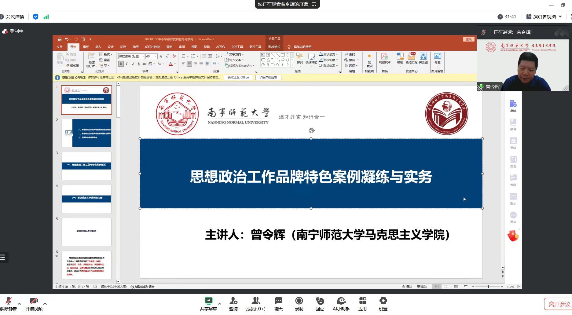 会上,曾令辉教授作了题为“思想政治工作品牌特色案例凝练与实务”的专题培训报告。报告从思想政治工作品牌特色案例的内涵与特点、凝练与撰写、品牌和特色三个方面详细介绍了思想政治教育工作案例的格式、写法、注意事项,指出了本次征集案例存在的共性问题、后期修改注意事项等,并与辅导员和思政教师进行互动交流,解惑答疑。