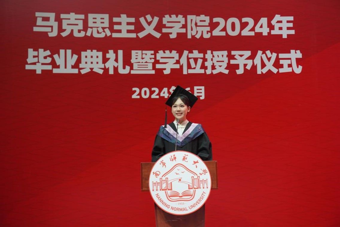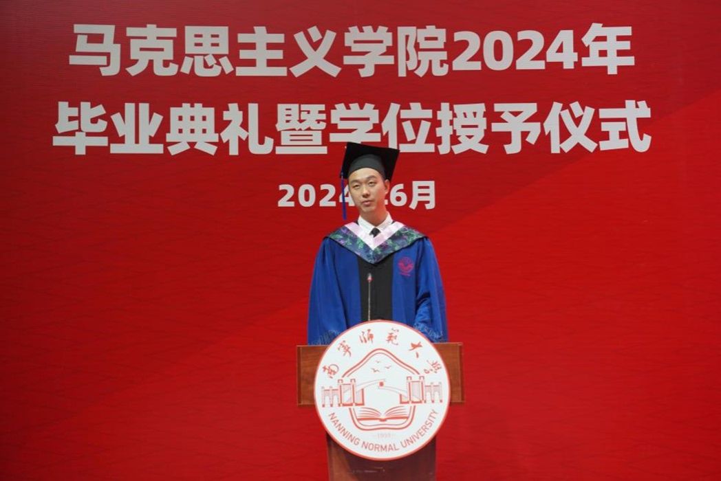 2021级马克思主义中国化研究专业硕士研究生姜凯博和2020级思想政治教育专业本科陶行知实验班潘嘉瑜分别代表研究生和本科毕业生发言。他们回顾了在南宁师大bevictor伟德官网的学习历程,对公司和老师们的栽培表达了感恩之情,表示在未来的道路上,将带着母校和老师们的期许与祝福,继续前行,书写更加辉煌的篇章!